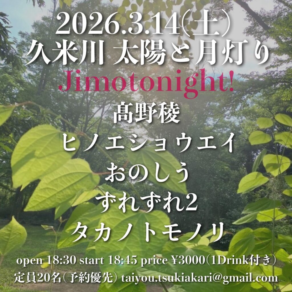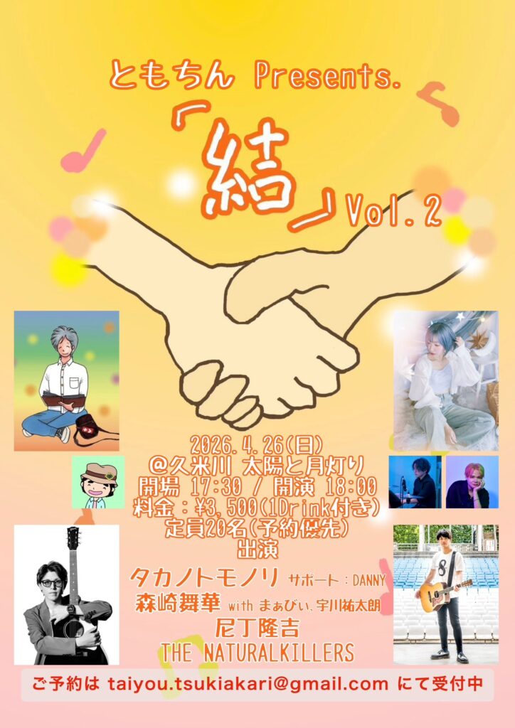 | 出演 | タカノトモノリ (1番手で18時頃から35分の出演予定です。) THE NATURALKILLERS 森崎舞華 尼丁隆吉 |