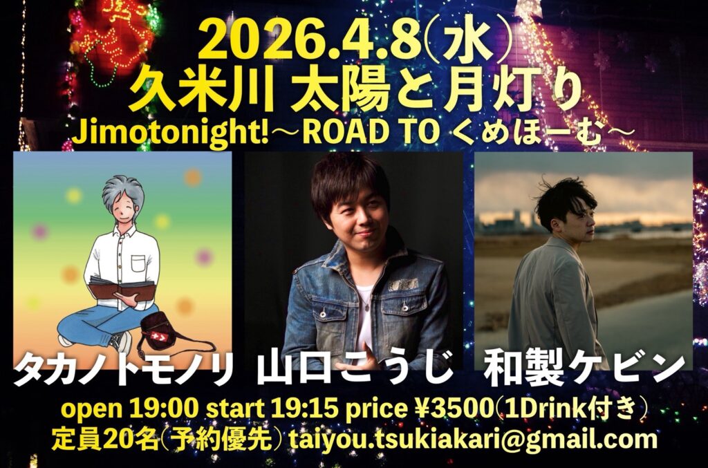 | 出演 | タカノトモノリ (1番手で19時15分頃から45分の出演予定です。) 山口こうじ 和製ケビン |